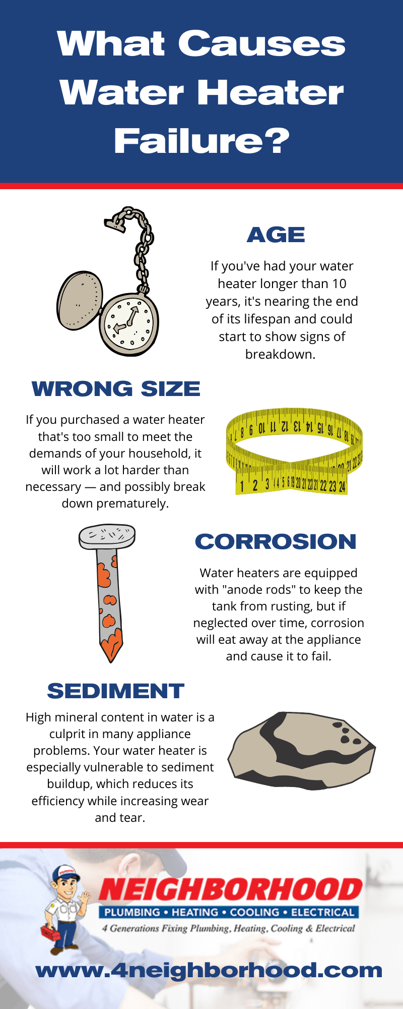 In the meantime, stay vigilant and be on the lookout for signs of a worn down or failing water heater. We’ve listed a few common reasons for water heater breakdown in this infographic.